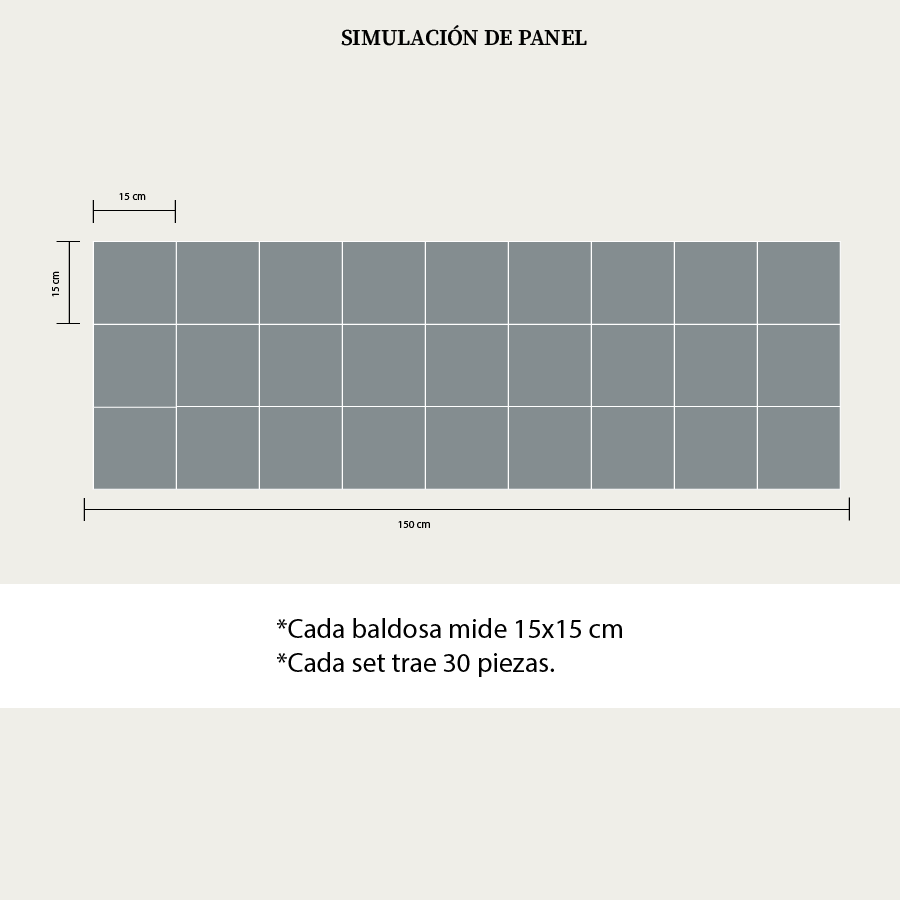 - Cada set contiene 30 piezas de 15x15 cm cada una.